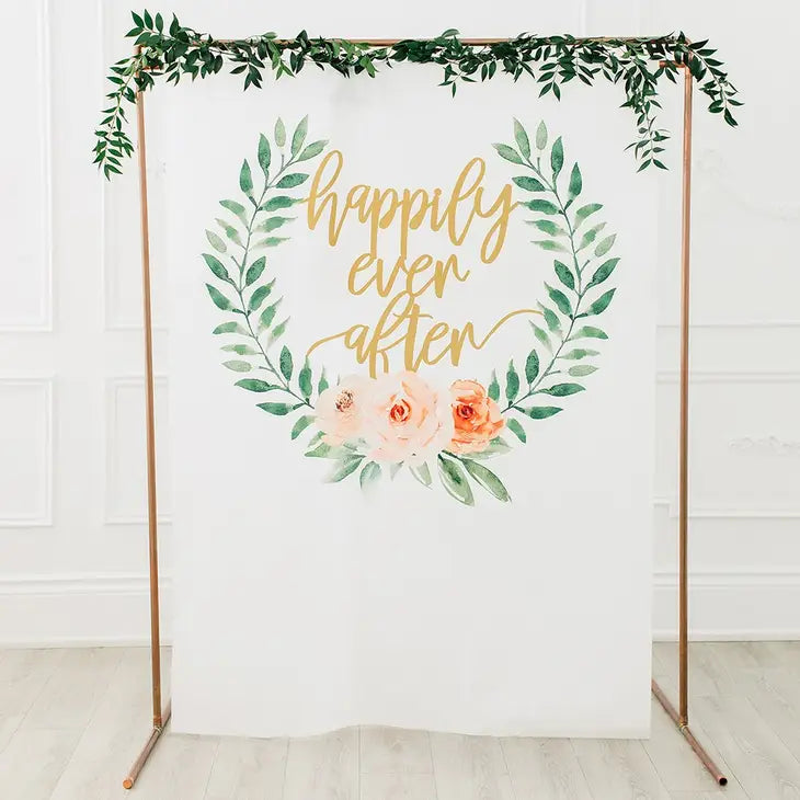 This "Happily Ever After" floral backdrop adds an enchanting and classic touch to your wedding or special event, creating the perfect setting for photographs and cherished memories. With its versatile design and timeless appeal, it’s a great addition to your celebration décor.